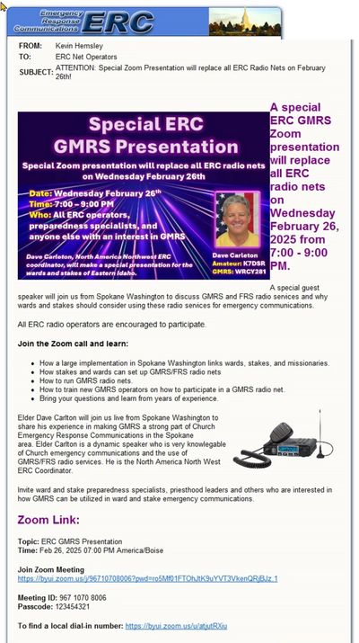 Elder Dave Carlton will offer live training via Zoom, for Church Emergency Response Communication specialists. The focus will be on GMRS radio networks based in wards and stakes. This Link will open Zoom meeting, or use Zoom Meeting ID: 967 1070 8006; Passcode 123454321.